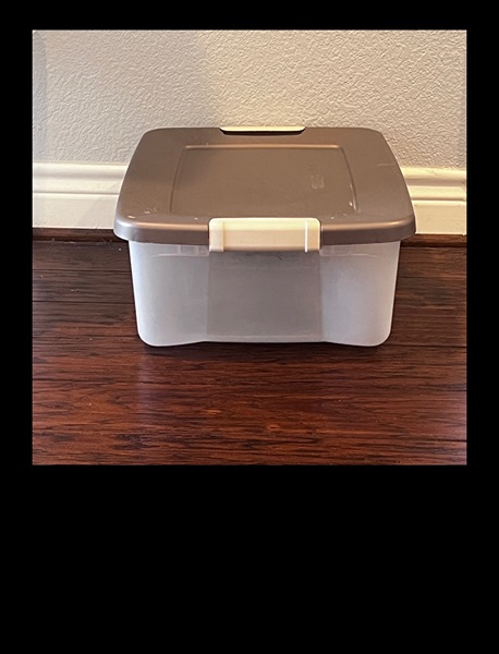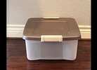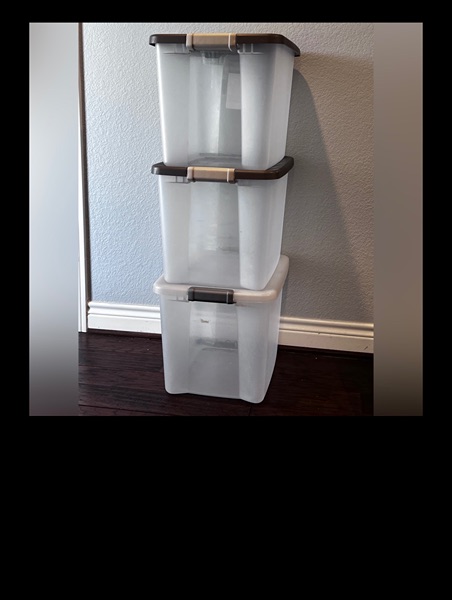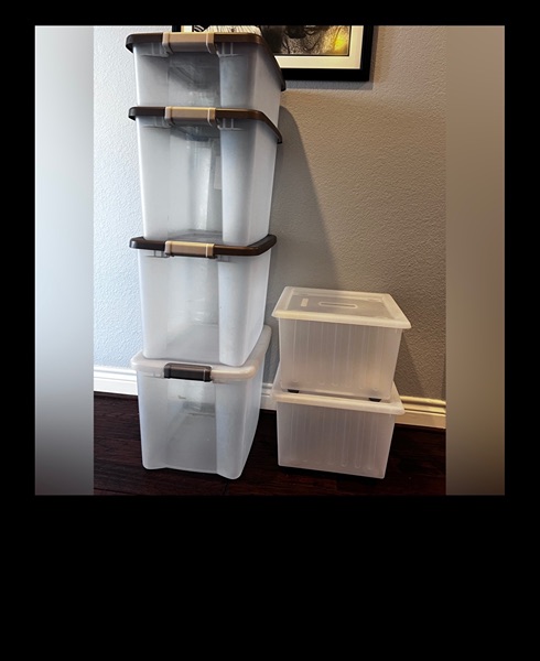 Three 50 qt Sterilite bins are 19 1/4" x 15 1/8" x 14 3/4" H, 1 smaller matching  bin at 18 7/8" L X  14 3/4" W X 8" tall.  In addition, there are two Ikea rolling bins with a small opening on lid.  They measure 15 1/4" L X 15 1/4" W x 10 1/4" H.  All in very good condition!