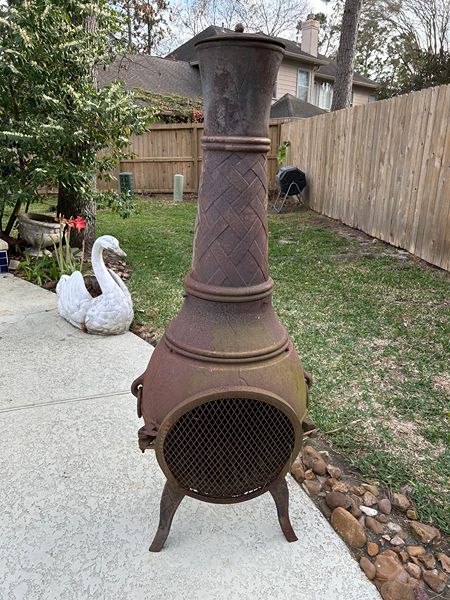 Very heavy cast iron chimena / fire pit. Has some surface rust but high quality item.