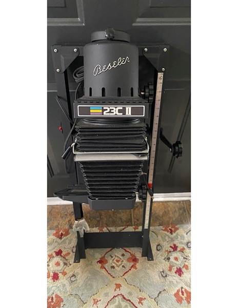 Beseler 23C2 enlarger; developng trays, film develooping cans, beakers, tongs, dodging tools and other miscellaneous items to be used in the darkroom. Movers lost the base of the enlarger at one time, but it can be repaired by just cutting another square piece of wood and remounting the enlarger. Screws and nuts and bolts are available in a bag.