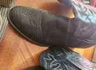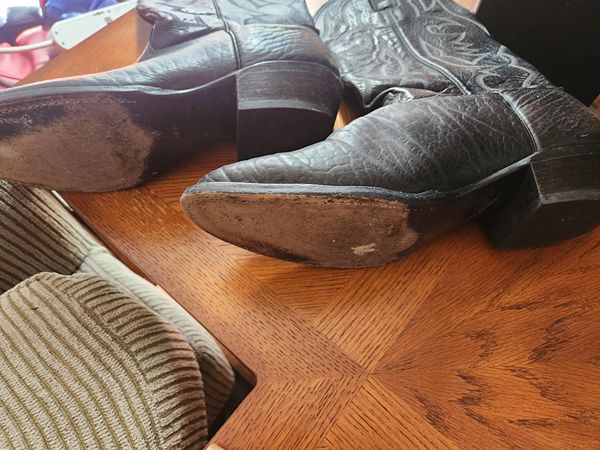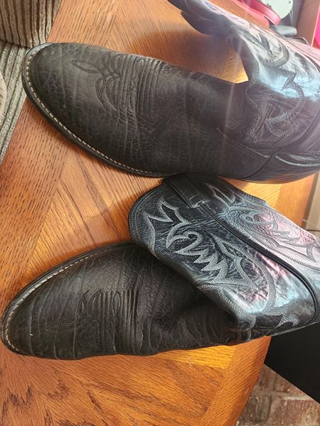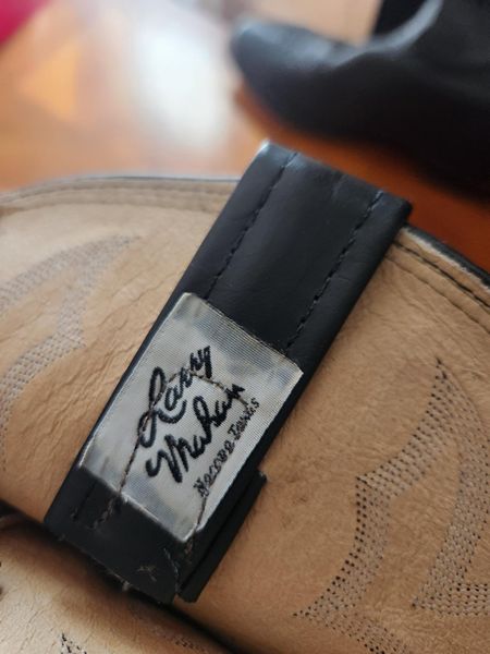 Stylish Larry Mahan black leather cowboy boots with intricate stitching. Gently used, Men's Size 14D.