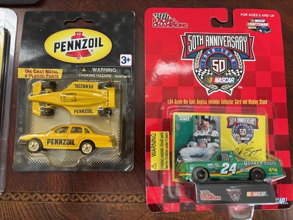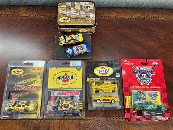 Small collection of NASCAR Collectibles includes Commemorative tin with #15 Michael Waltrip NAPA and #1 Steve Park Pennzoil cars, 4 other unopened blister packs.
