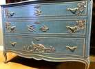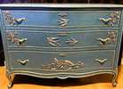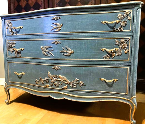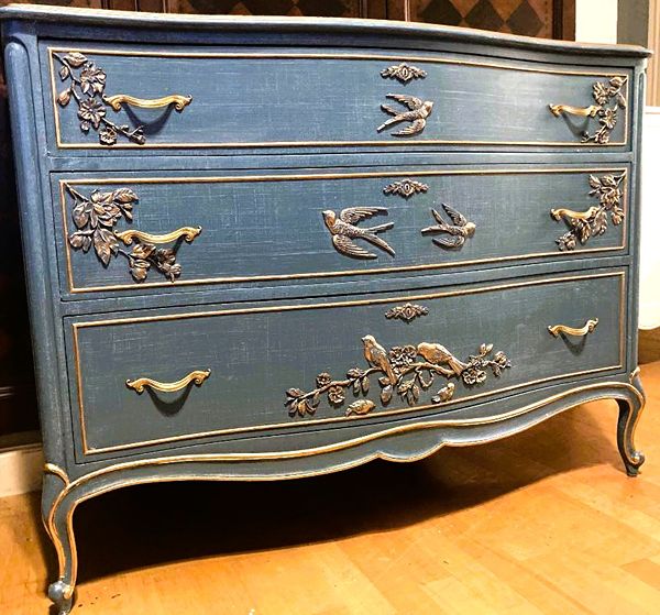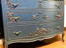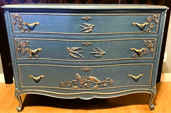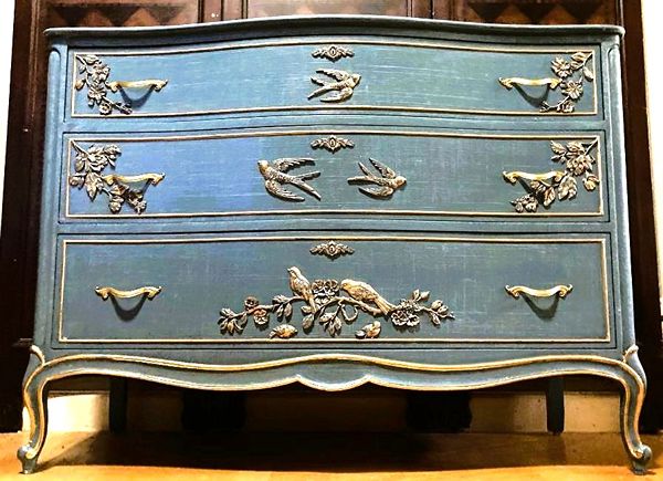 - We cleaned, filled, sanded, primed, added worn denim texture, applied hand poured moulds of birds and branches then painted in layers, gilded and sealed for durability.