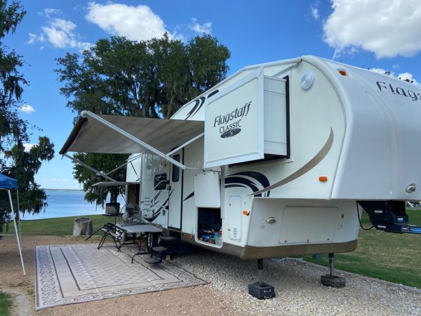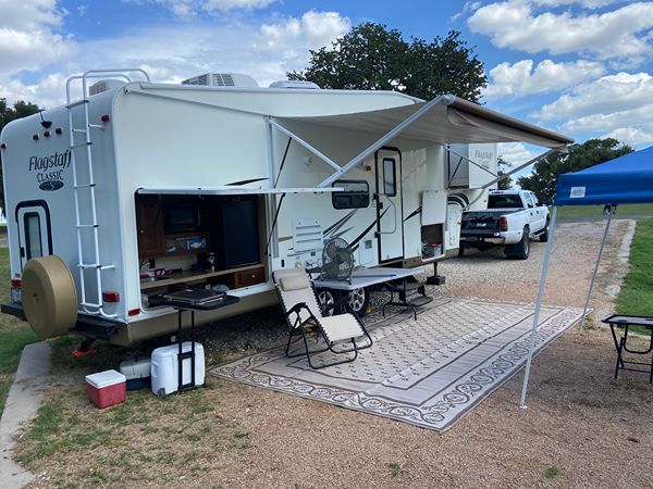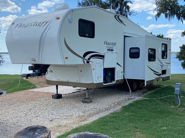 2011 Forest River Flagstaff Classic Super Lite 5th Wheel--Floorplan 8528 TBWS. 2 Slide outs. (one is closet in front bed) Huge amount of pass through storage. Door to back bunk room where bottom bed folds up for additional storage (bikes etc.) Power Awning and jacks. Always stored under Covered storage. Upgraded Mattress in Primary Bed, 2 TV's, (one in one out) Dinette can also make a bed, Bunk House in Back, Cold A/C with ducts to bedrooms, Outdoor Kitchen features Large Fridge, 2 Burner fold out Cook Top, Microwave, Sink and pull down TV in front of Microwave outside. 2 total microwaves, one inside and one outside. Receiver hitch on back to the frame for additional towing needs if desired etc. Kids are grown and we just don't use it enough anymore. $12,500 obo
