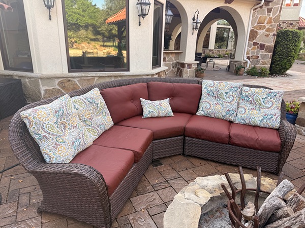 - 3-piece ratan sectional with Sunbrella cushions. The top cushions are not Sunbrella but the bottom cushions and the frame are. Paid $2900 for set. Offered at $650