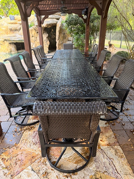 - 7 x 3 ft solid iron table and 8 reclining and rocking chairs. (Picture shows 2 tables - only selling 1 table and 8 chairs) Paid $4900 for set. Offered at $950