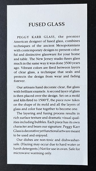 Fused glass plate by Peggy Karr.  This hand-crafted rectangular plate measures 9.75 x 5.5-inches and is in excellent condition with no chips or cracks.  It is American made and is non-toxic, microwave and dishwasher safe (avoid hard water or harsh detergents).  A great piece for serving or decorating. NOTE:  Stand in picture is not included.  Pick up at Alden Bridge in The Woodlands. Please contact me through this site or text me for a quicker response if interested or have any questions.
