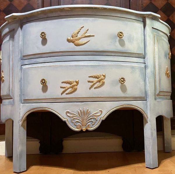- We cleaned, filled, sanded, primed, added layers of creams and blues for a beautiful cloudy sky look. Then I applied hand poured moulds of birds, gilded and sealed for durability.