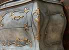 -We cleaned, filled, sanded, primed, painted and glazed in layers of blues, cream and grays then highlighted the details with gold gilding.