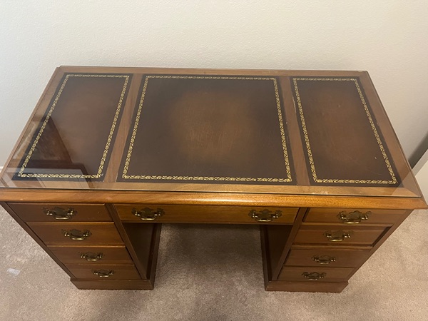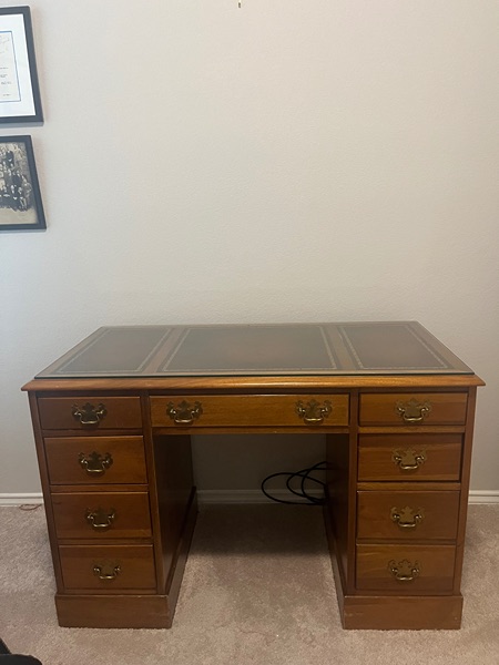 This is a very solid, beautiful wood desk. There is lots of storage. The dimensions are 44 inches wide, 22 inches deep and 29.5 inches tall.