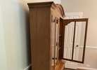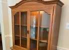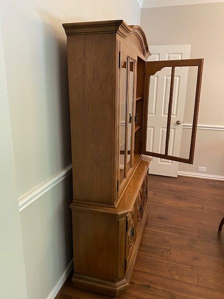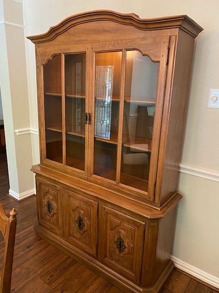 A vintage dining room set with main table 70" long and 41" wide with leaf. Insert leaf is 12" wide. Five chairs, and china cabinet that is 53" W x 75" H x 16" Deep, includes one light inside and shelves and drawers (a heavy item). Made in the 70's, no maker labels.