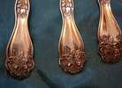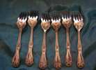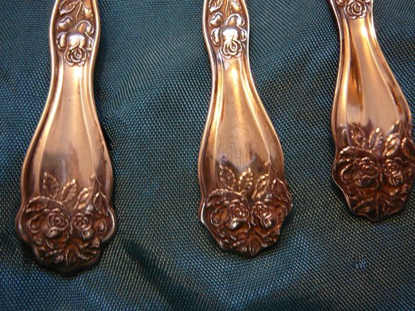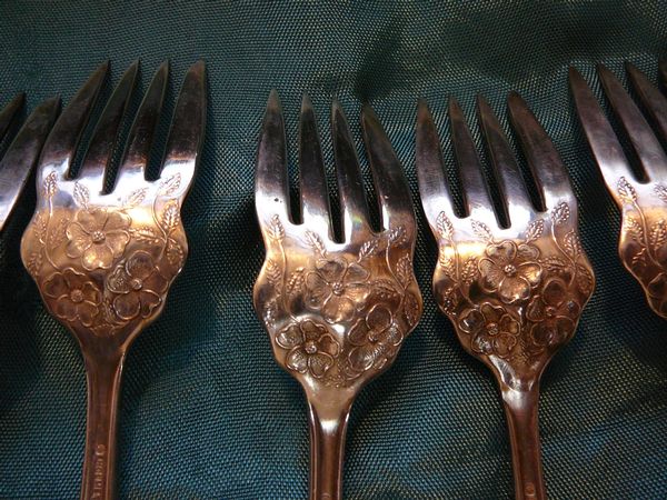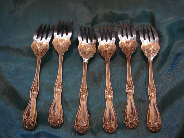 6 American Beauty Rose Silverwear by Holmes & Edwards XIV , Silverplate , 6 inch Salad forks , Super nice , 1900 - 1940's , $50