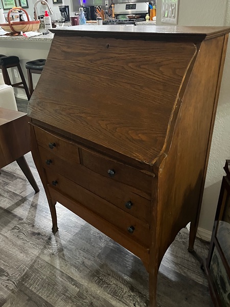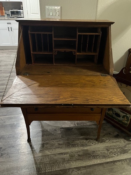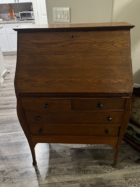 Really cute secretary desk, perfect for storing stationary, small objects and random things you don't know what to do with. Priced to sell! Measurements are 30 inches wide 43 inches tall and 16 inches deep