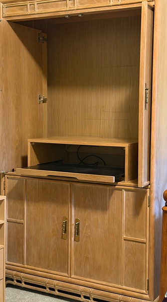 Gorgeous Star Furniture Armoir or TV/ Music Entertainment center. This solid oak piece is 75" tall and 45" wide. The color is "white wash" giving it a lighter distressed look. We also have dresser drawers that match. We are reinventing our guest room and it no longer fits in the room. It is heavy, solid and beautifully made. We originally used this for TV then it became bedroom storage. We added some drawers which are temporary and you are welcome to take. There are several pull out platforms, nooks and open shelves and drawers. The top doors can be pushed back into the cabinet out of the way. The cabinet is immaculately clean, just became too large as we downsize our home. Add a rod across the top for hanging clothes. The back of the platform has a plug to help you hook up to the power source.