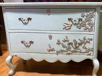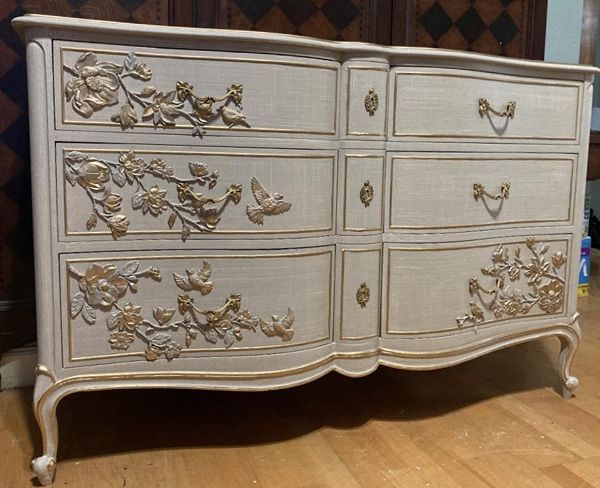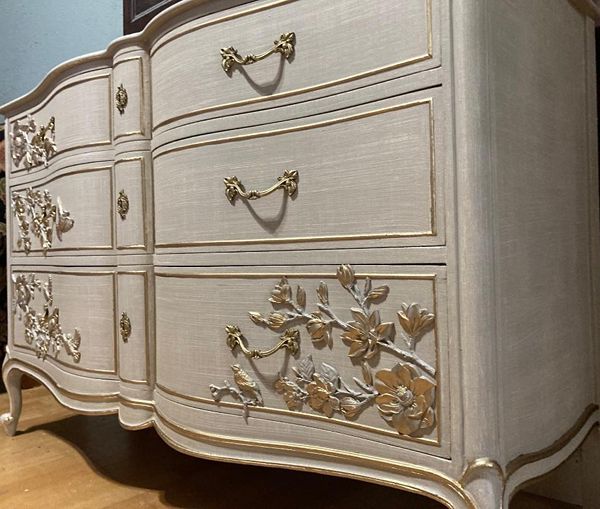- We cleaned, filled, sanded, primed, added rich grass cloth texture. I then hand poured moulds of birds and magnolia branches in bloom, composed and attached each one, then painted in layers for beautiful depth, finally I gilded and sealed for durability.