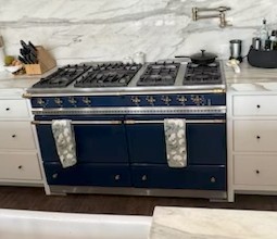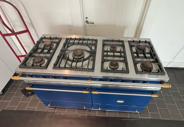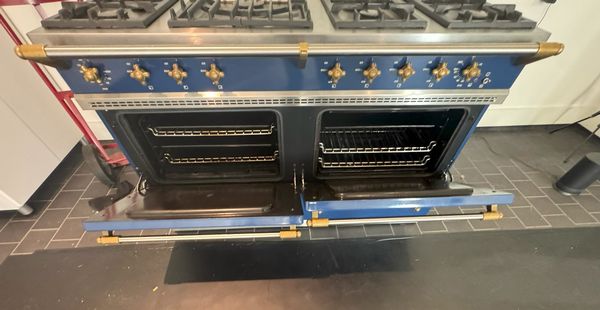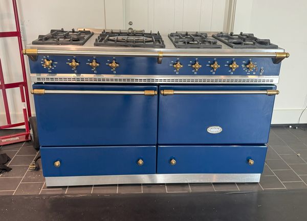 For Sale - Lacanche Range, Sully Model - 55' wide. Twin gas ovens, Dark porcelain blue with Brass accents. Unit new in 2016, removed for a remodel. Woodlands location.
