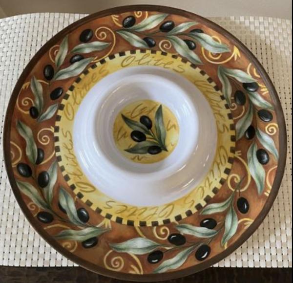 The Chair King Store : Two Crafted dinnerware using the highest quality Melamine, a shatter-proof plastic that's FDA-approved and BPA-free, Melamine dinnerware will make dining outdoors or indoors a very nice look. Model Tuscan Olive. Diameter 14" . Price for Both $ 16, one for $10