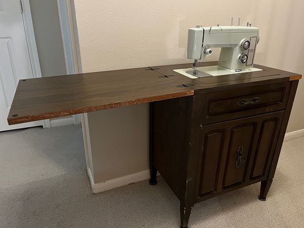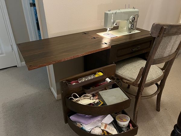 Kenmore Sewing Machine. A very functional, workhorse of a machine. Folds into cabinet when not in use. Plenty of storage. Footpedal. Sewing accessories included. Includes Confortable Chair. Call/Text Kevin: 832-928-1998 (Panther Creek area)