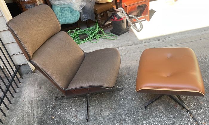 Vintage Mr. Chair by Plycraft and ottoman project set. My intentions were to have both reupholstered but never got around to it. No cracks or breaks in chair shell or ottoman shell. Ottoman is leather and chair is fabric. $300 obo. Please call or text for more photos or any other questions. Thank you