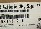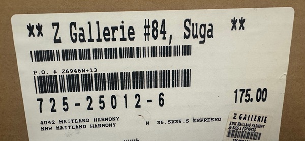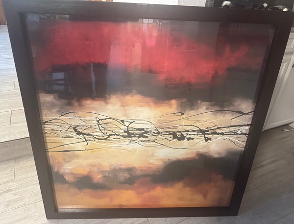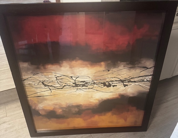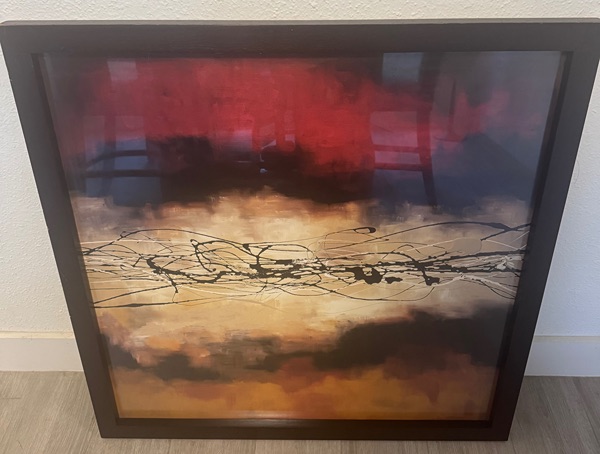 The artwork is a framed print titled "Harmony in Red and Ochre" by artist Laurie Maitland, published by Canadian Art Prints, Inc. It's an abstract piece measuring approximately 35.5" x 35.5" in an espresso-colored frame (no glass). Based on the label details, it appears to have been sold through Z Gallerie with an original retail price of $175.