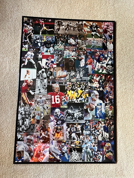 Vintage sports montages taken from 1970's-1980's Sports Illustrated magazines. Six 2'x3' and one 2'x2'. Separate montages for NFL football (pictured), NCAA football, NBA basketball, MLB baseball, golf, boxing and the Olympics. Prefer to sell as a set. Best offer.