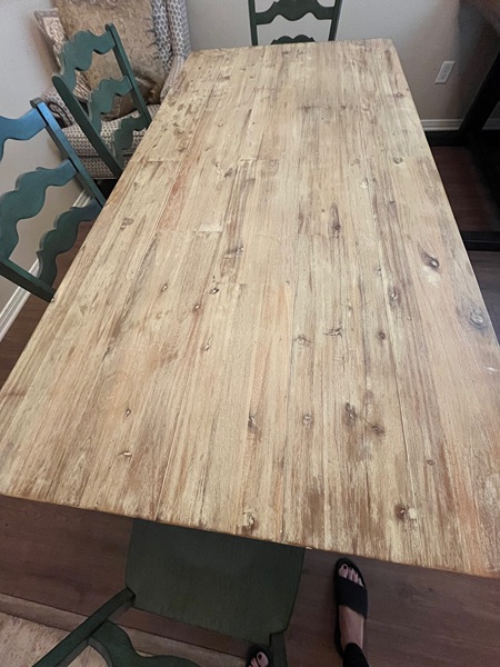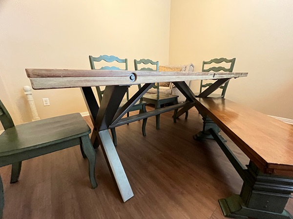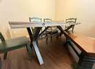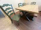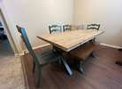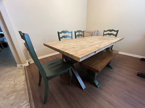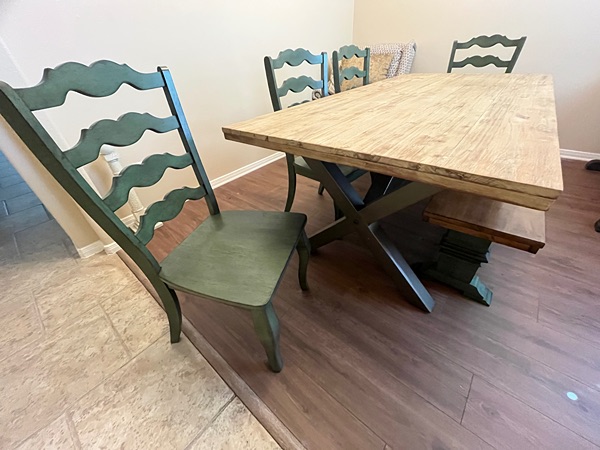 Reclaimed wood dining table originally purchased from Laurie's in Tomball. 4 sage color chairs and matching bench. Excellent used condition.