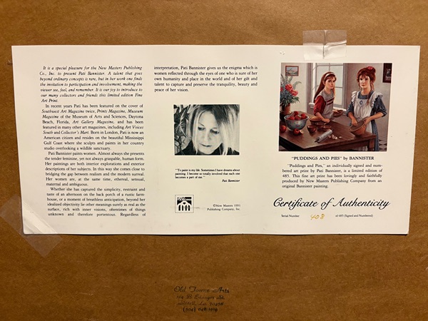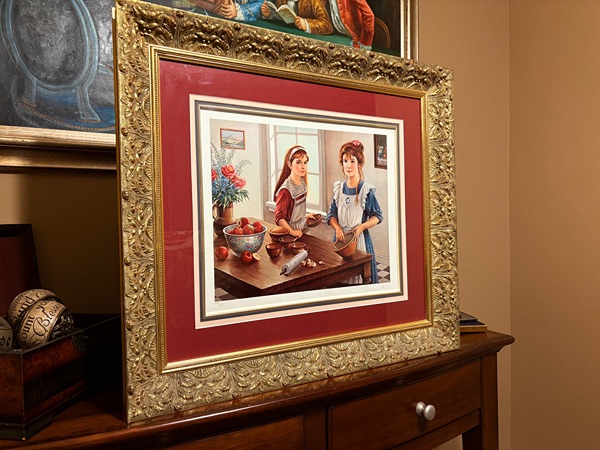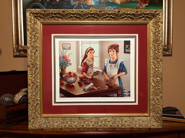 The art work depicts two young women in a kitchen setting, engaged in the activity of baking, with ingredients like apples and a rolling pin visible on a table. Pati Bannister is known for her romantic and nostalgic art, often featuring young women and themes of childhood or domestic life.  The ART work comes with a matted fantastic frame in pristine condition. Produced in 1990, this contemporary piece reflects the style of illustration art and is an original print from the United States. The artwork is a unique and collectible item that would make a lovely addition to any art lover's collection.