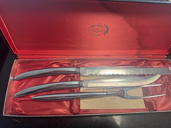 - Contents: The set includes a carving knife, a bread knife (with a serrated edge), and a carving fork.
