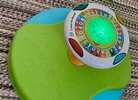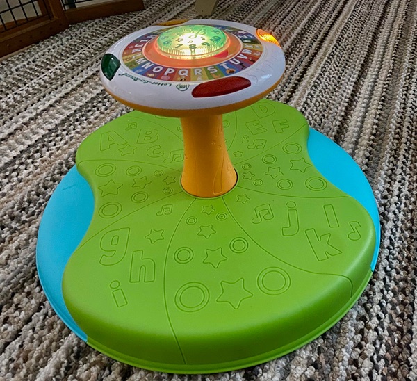 - Spin around the wheel to build motor skills while lights flash and music plays