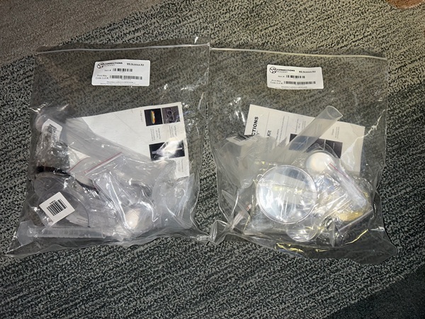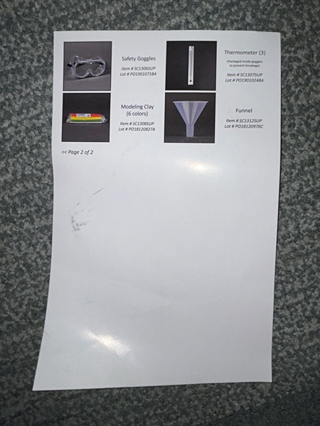 One 10ml graduated cylinder, one 100ml graduated cylinder, universal pH paper, hand lenses, petri dish, dropper, safety goggles, 3 thermometers, and a funnel. Instruments are made of plastic, there's no glassware. The only thing missing from the original kits is the modeling clay. Most other items are new in packaging. $5/both