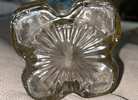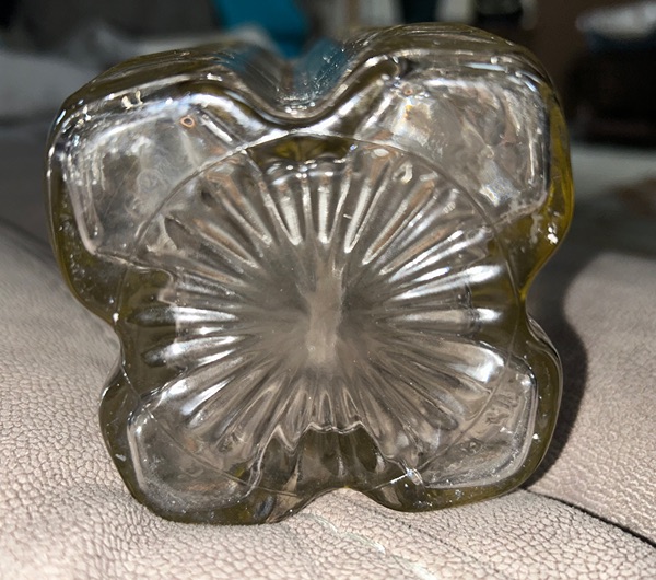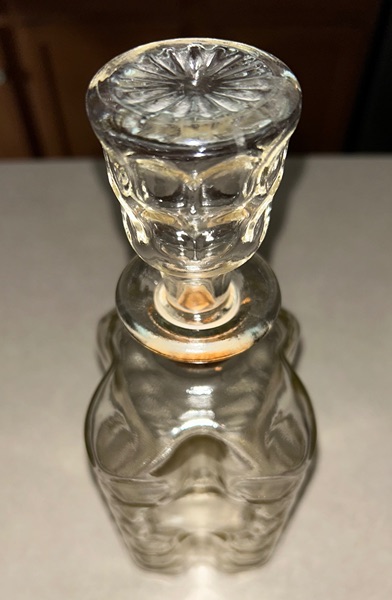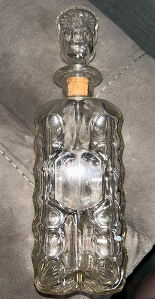 Vintage 11" empty glass whiskey bottle decanter with thumb pinch circles and cork stopper. There is a crack in the cork (pictured). Otherwise, this is in excellent condition for its age, with no chips or cracks in the glass. $20