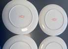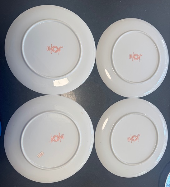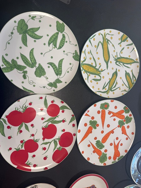 These plates are from the "Garden Fresh" pattern by Tabletops Unlimited, a line of vintage stoneware dinnerware featuring whimsical vegetable motifs on a white background with colored rims. Each plate focuses on a single vegetable type scattered across the surface: corn (with a yellow/green theme), carrots (orange), peas (green), and tomatoes (red). They were likely produced in the 1990s or early 2000s, often made in China or Japan, and are microwave- and dishwasher-safe.