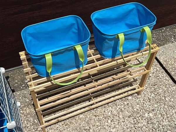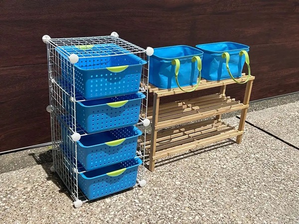 Includes a metal rack with blue baskets and a wooden shelf with blue bags…$50 firm