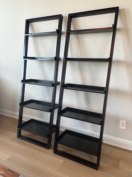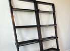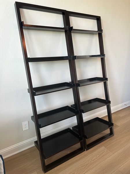Two matching leaning bookshelves, expresso color. Measures 74" tall and 25.5" wide.
