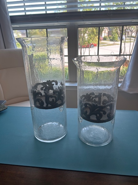 Purchased from Laurie's these beautiful candle holders are very well made and measure 16" and 13" tall, with a 7" diameter.