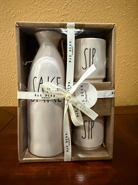 New, unopened Rae Dunn "SAKE" carafe and two "SIP" ups.