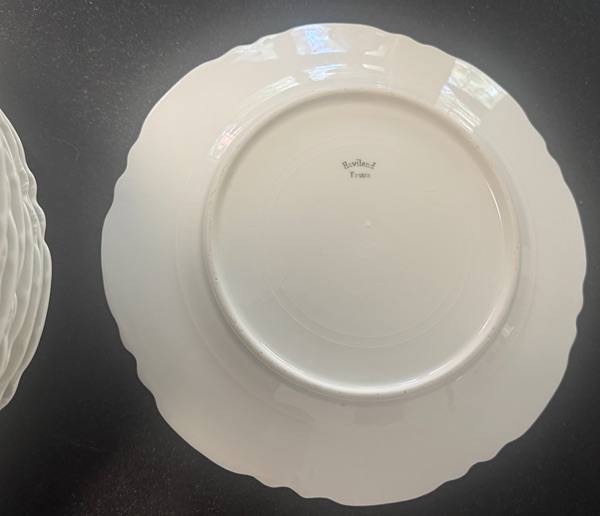 These are antique Haviland Limoges France dinner plates in the Ranson pattern (also known as Schleiger #1), featuring an all-white porcelain design with scalloped, embossed edges. They measure approximately 9.5 inches in diameter, typical for dinner plates from this early 20th-century French maker.