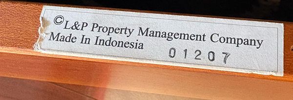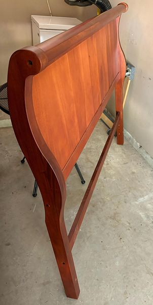 Headboard-only sleigh bed style piece made of solid mahogany wood measures 61"W x 50"H x 6"D. Manufacturer's holes at bottom of legs allow for affixing to standard metal bed frame of a queen sized mattress. No chips or water marks. Pristine condition. Made By L&P. Property Management Co. Smoke and pet-free home. Made in Indonesia