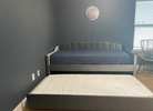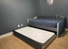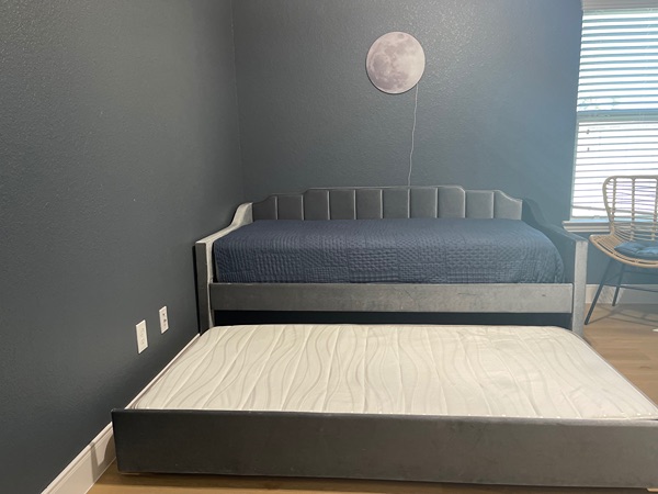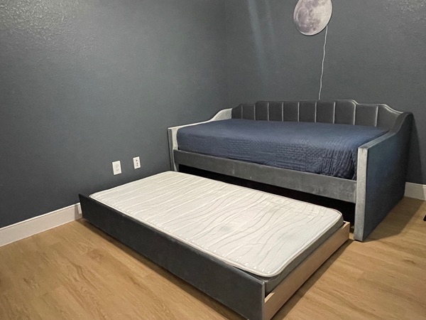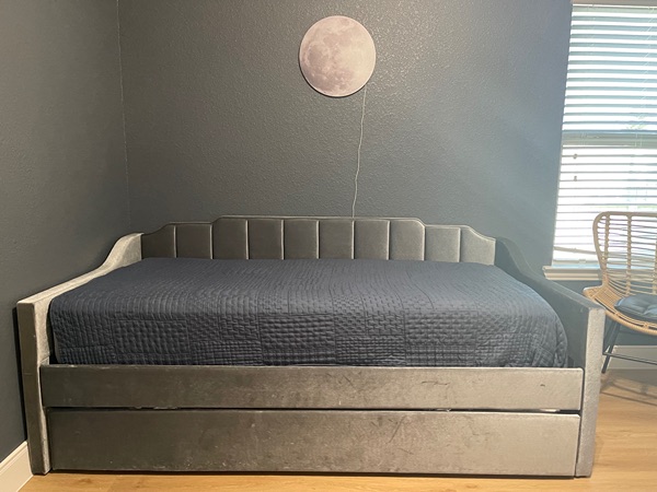 Includes 2 like new mattresses. Gray velvet upholstery, Used in guest room only slept on a handful of times. Excellent condition