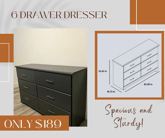 Spacious and Sturdy Organize in style with this dark gray 6-drawer dresser—clean look, generous storage, and a durable build. Ideal for bedrooms or guest spaces. Dimensions: 53.35' L x 16.73' D x 33.43' H. Smooth, easy-access drawers keep clothes and linens tidy. Priced at just $189 for quick pickup. First come, first served. Pickup preferred; local delivery available for a small fee. Message now to schedule a viewing! 🛏️🧦