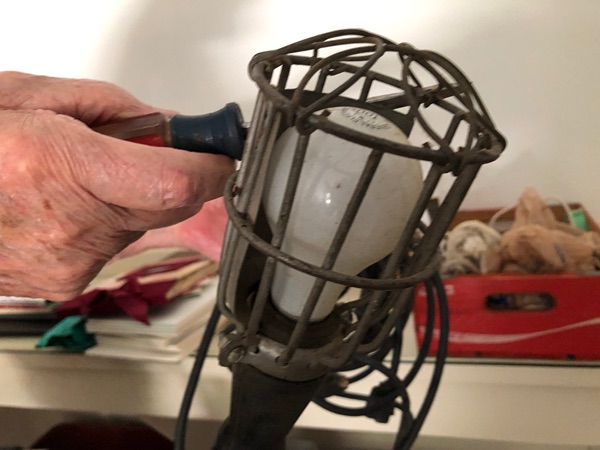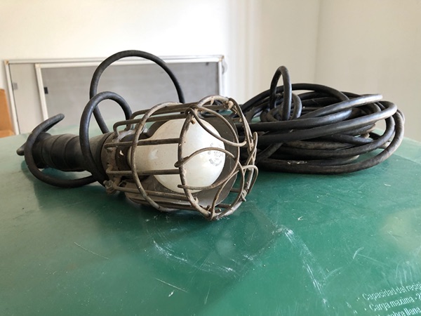 Has hook so light can be hung. Light is in protective cage. Cord might need some work. Asking $2.00.
