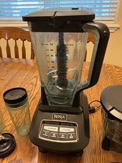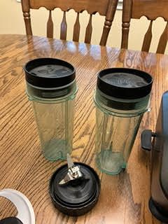 Ninja 1500 watt blender with 72 and 64 oz pictures with lids, 5 blending blades, 2 smoothie containers, extra lid for 72 oz all in great condition