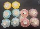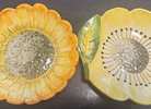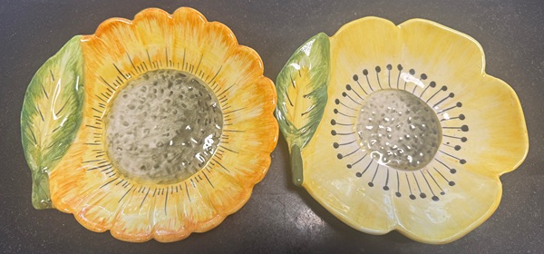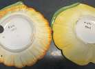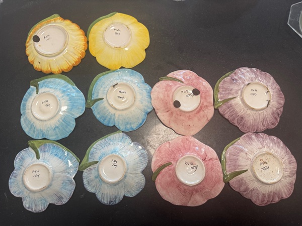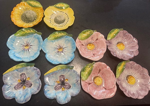 Decorative ceramic dishes or plates molded in the shape of stylized flowers (petals, leaf‐elements) and hand-painted in bright glazes.