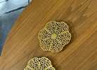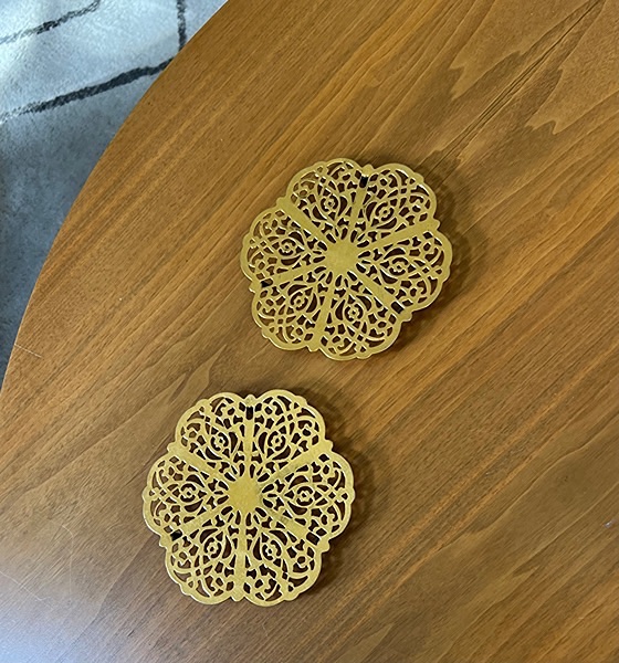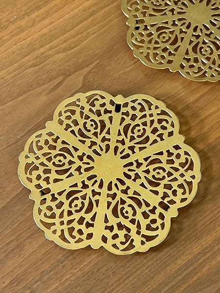 From the 1970s, Made of chrome and gold plated metal, both trivets have a diameter of 4” and each comes with three rubber tipped feet for stability. Produced by the Leonard Silver Company under the Irvinware brand, this original piece exudes the fashion and elegance of the 1970s era. Perfect for all occasions, this trivet is a unique collectible item that adds a touch of vintage charm to any kitchen or dining area…$10 total, firm