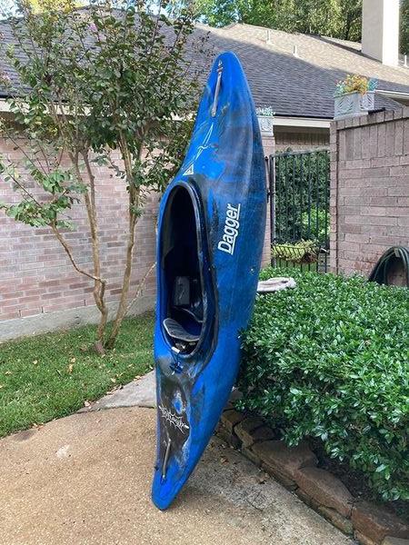 Dagger Outlaw kayak. Great fun whitewater fun boat. ( 7’ 6” length). I’m 5’ 9”, 140 lbs fits perfectly. One of our group is 165 lbs, also happy with boat. Handles great, most buoyancy in the bow, so fast turns and easy stern Enders. Stable, easy to roll, good beginner or intermediate play boat and river runner..