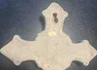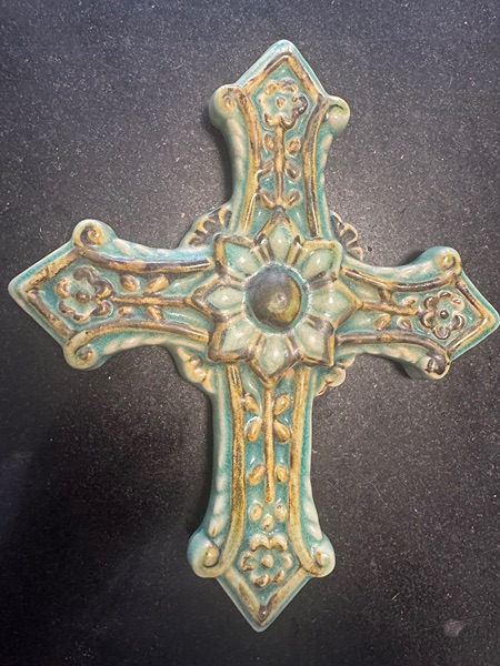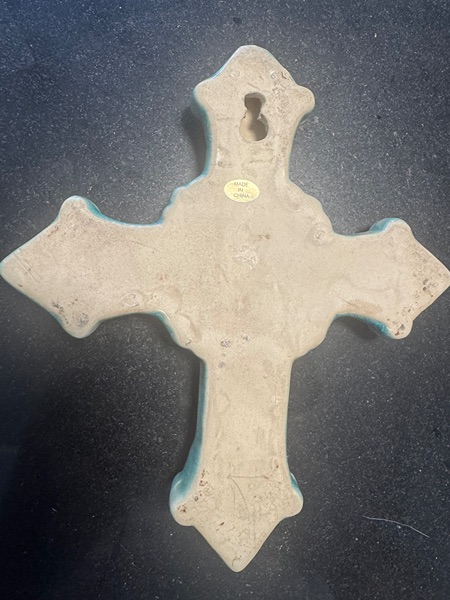 Ceramic cross (8 inches tall) with a turquoise glaze, gold-painted floral and scrollwork accents, and a central daisy-like flower motif. The “Made in China” label on the back suggests it’s an inexpensive import, possibly from the 1990s-2000s, rather than a handmade artisan or antique piece (e.g., not authentic Mexican Talavera pottery, which commands higher prices).