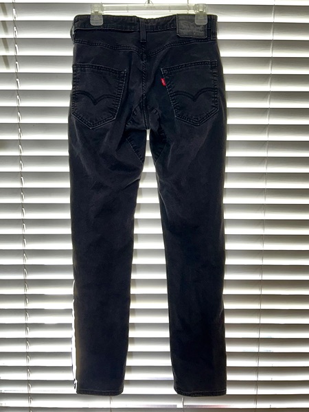Levi's men's 29x32 black jeans with reflective double side stripes. 98% cotton / 2% elastane. Classic 5-pocket design with zip/button closure. Very soft fabric, very good condition, no holes, smoke free home. $10