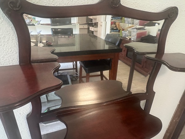 This is a antique Victorian whatnot shelf (also known as an etagere), from the late 19th or early 20th century. It's a freestanding display piece made of dark wood (possibly mahogany or walnut) with multiple graduated tiers of scalloped shelves, beveled mirrors on several levels, and ornate cast metal brackets providing structural and decorative support. These were popular for displaying knick-knacks, curios, or small ornaments in Victorian homes.
