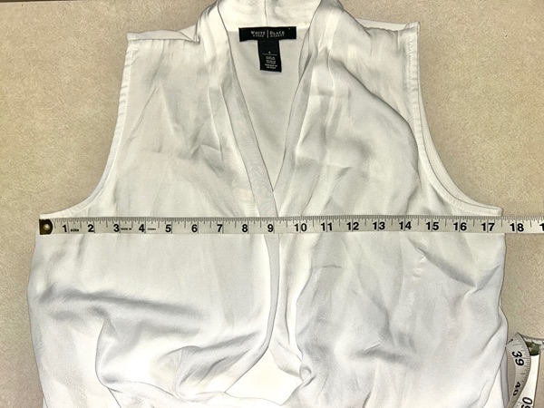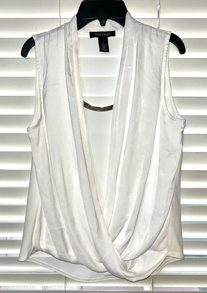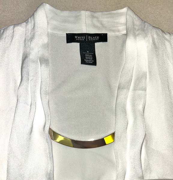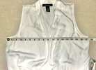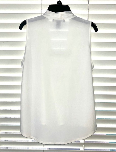 White House Black Market white sleeveless blouse, size small. The round neckline has a gold colored bar necklace sewn in. It has pleated front accents and measures about 17-17.5 inches from pit to pit. It's in very good condition from smoke free home. $5