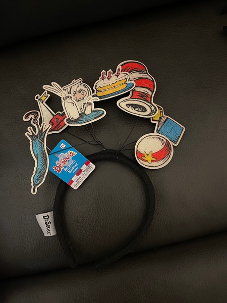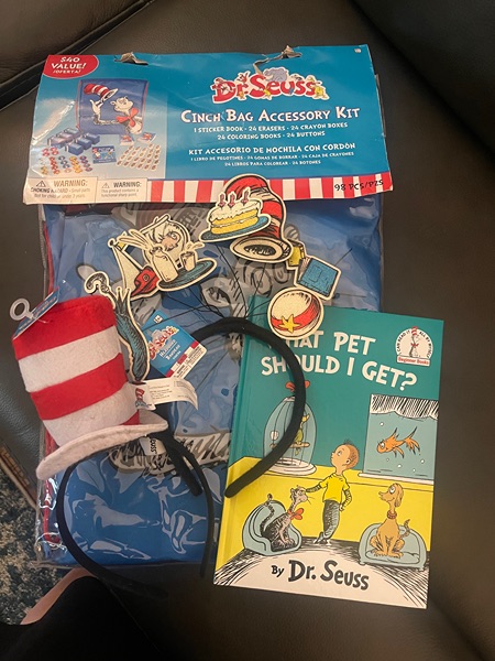 Dr. Seuss cinch bag with accessories, 2 story headbands, and Book. All brand new! Great for a teacher, party, Halloween, storybook day!
