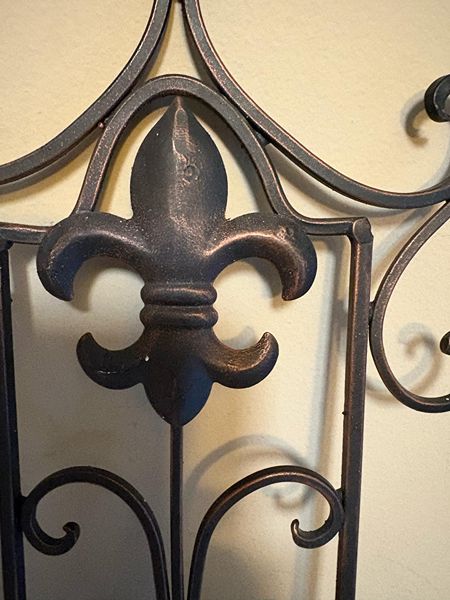 Beautiful metal crucifix with an inlaid center with ornamental stones in bronze finish. A beautiful fleur-de-Lize is displayed at the top. The overall finish is Baroque. The dimensions are: Height 35" Width 28". It is in magnificent, like-new condition.